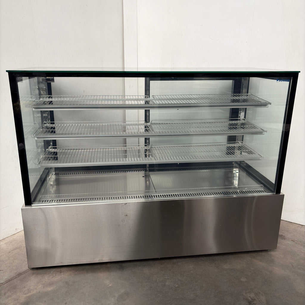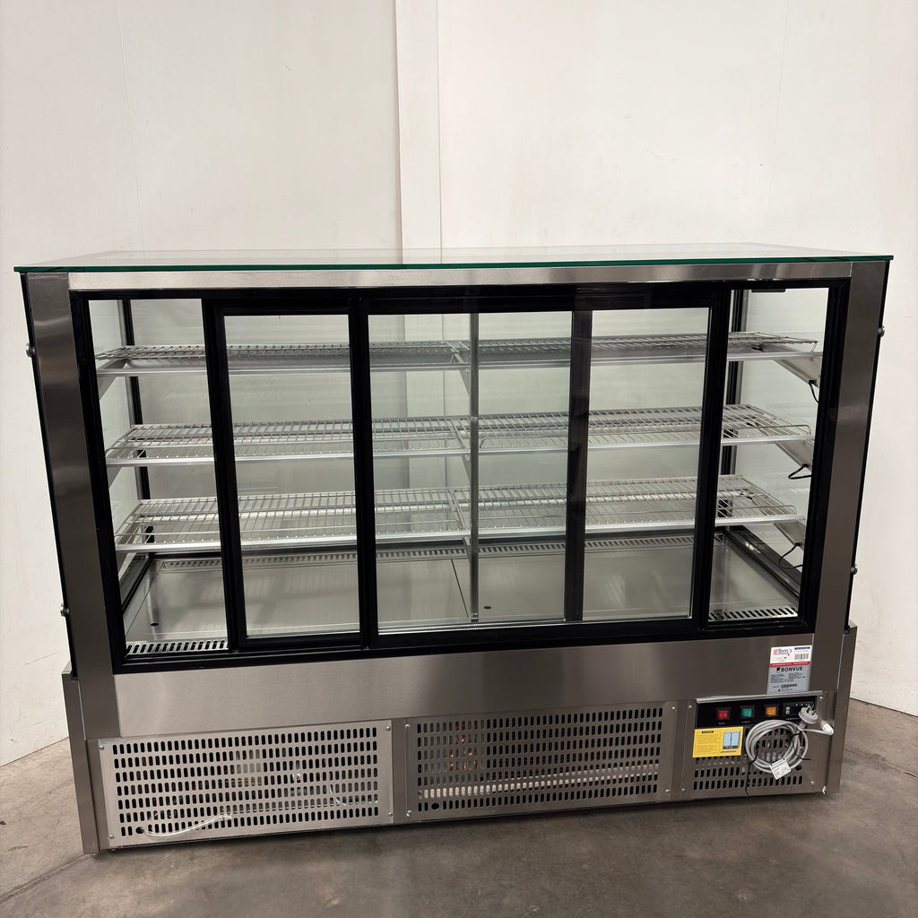 Square Glass Chilled Food Display. Features Square Glass, 4 Display Levels, Internal LED lighting, 2 x Rear sliding glass doors, Digital temp controls, On castors, Climate class normal, Triple-glazed glass front with heated wire filaments to stop condensation, S/S Finish, Scratches & Dents, Gross Volume 870L, 10 Amp 1 Phase, 1800mmW x 740mmD x 1345mmH, 287KG