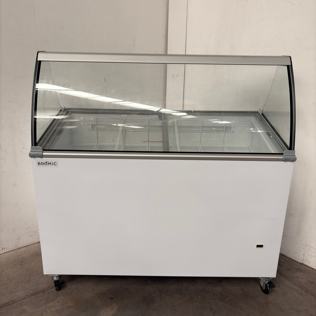 Curved glass Gelato Display. Features 7 pan capacity (No pans supplied), Internal LED Lighting, 2 x Sliding Glass Doors, Digital temp controls -22°C to -12°C , Climate class normal, On castors, White finish, Scratches & Dents, Curved glass, 10 Amp 1 phase, 1300mmW x 620mmD x 1300mmH, 81KG