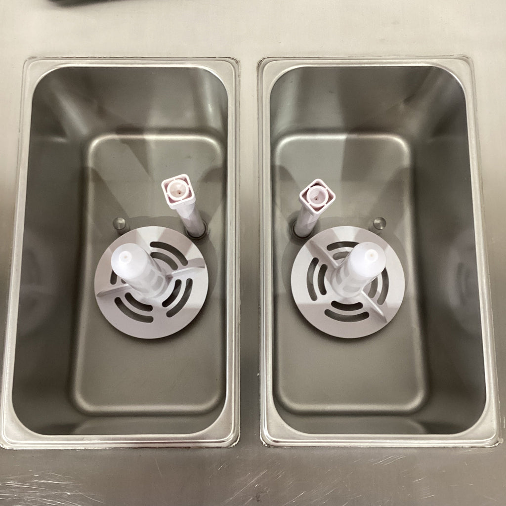 Ice Cream Machine. Features Up to 60L/H (450 - 700 serves) per hour depending on product, 2 pans, 12L capacity per pan, Gravity feed, On Feet, Climate class normal, S/S finish, Surface scratches, 20 amp 1 phase, 560mmW x 970mmD x 960mmH, 200KG