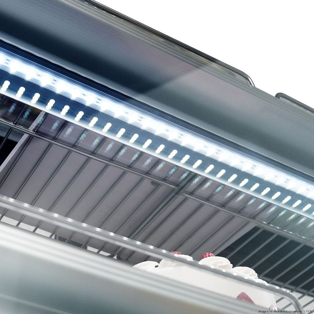 This impressive cake display has two levels of shelving, strong secop compressors for functionality, LED lighting to see inside the interior, self-evaporating drainage to remove moisture, digital temperature control, sliding glass rear doors, triple glazed front with heated filaments – all encased within a stainless-steel framework.