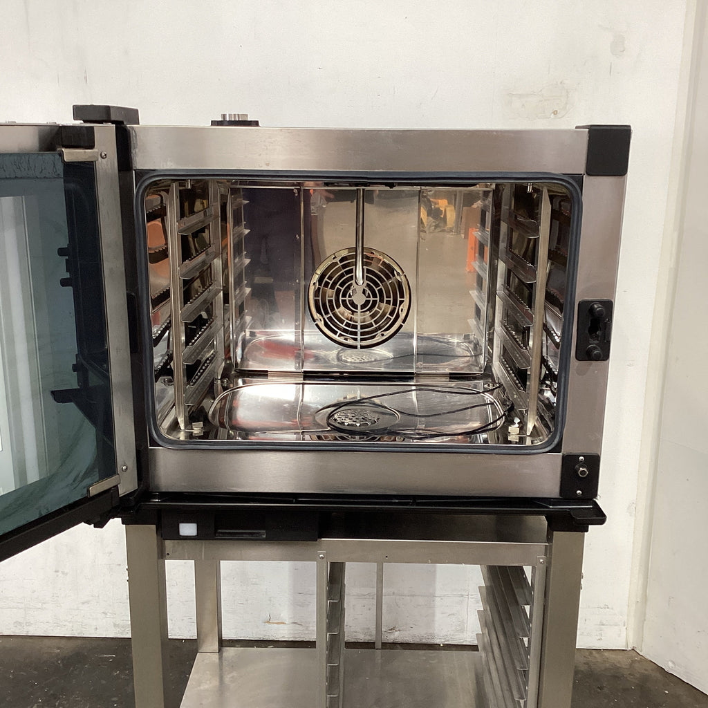 Combi Oven. Features 5 tray capacity, No trays included, Touch screen controls, Self cleaning, Door opens to LHS, On stand with 7 tray capacity, Adjustable feet, S/S Finish, Scratches, 25 amp 3 phase hard wired, 755mmW x 870mmD x 1400mmH, 75KG