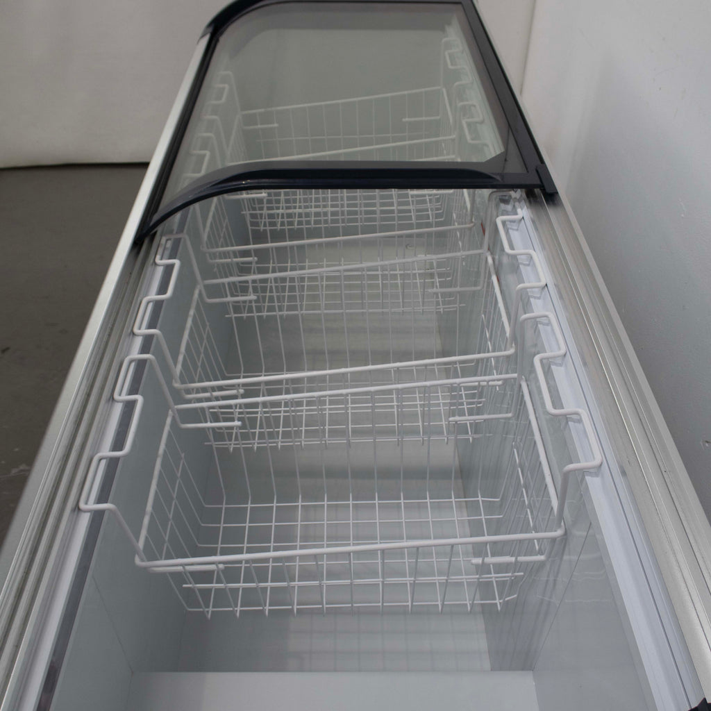 Chest Freezer. Features 2 x Sliding glass doors, 4 x Baskets, On castors, Climate class normal, Drainage plug, White, Scratches & Dents, 75mm thickness insulation, Fully automatic operation, Interior LED light as standard, 10 Amp 1 Phase, 1810mmW x 670mmD x 850mmH, 86KG