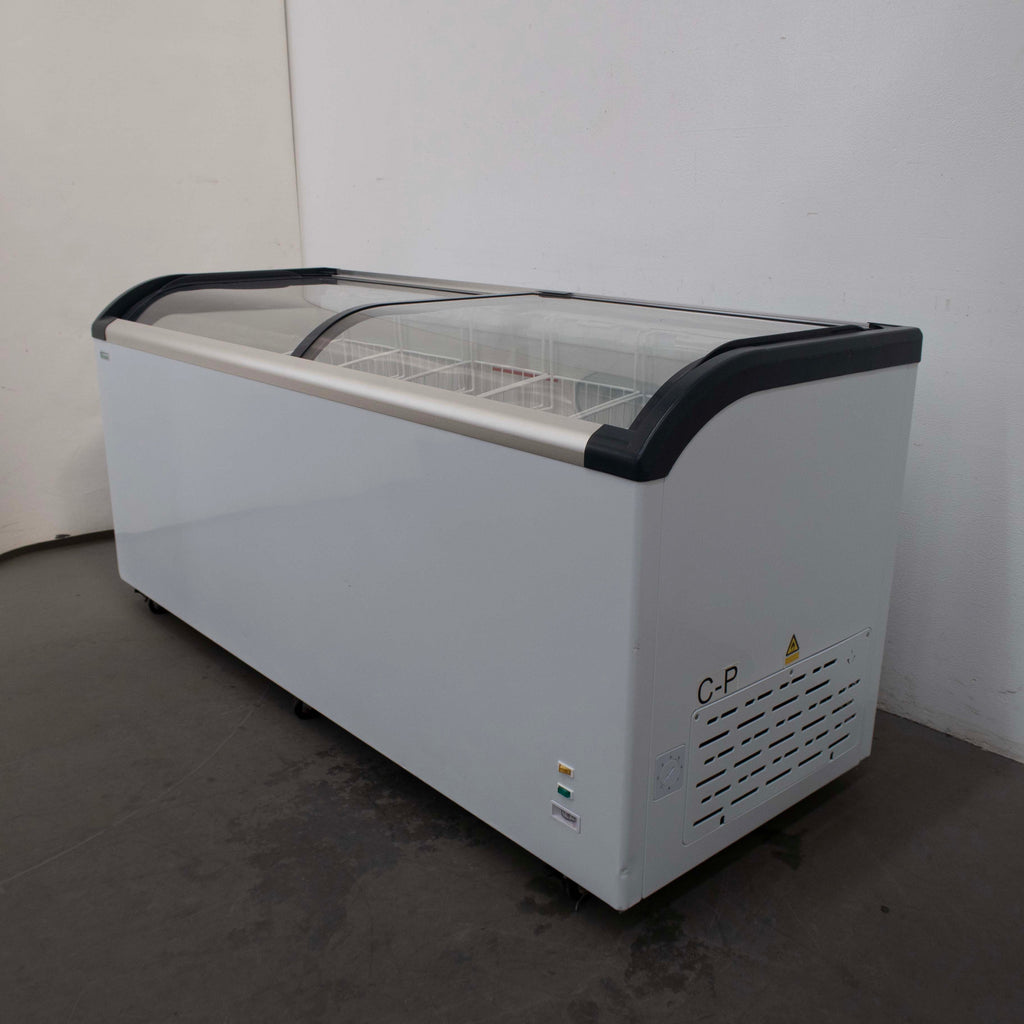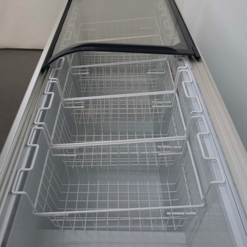Chest Freezer. Features 2 x Sliding glass doors, 5 x Baskets, On castors, Climate class normal, Drainage plug, White, Scratches & Dents, 75mm thickness insulation, Fully automatic operation, Interior LED light as standard, 10 Amp 1 Phase, 1810mmW x 670mmD x 850mmH, 86KG