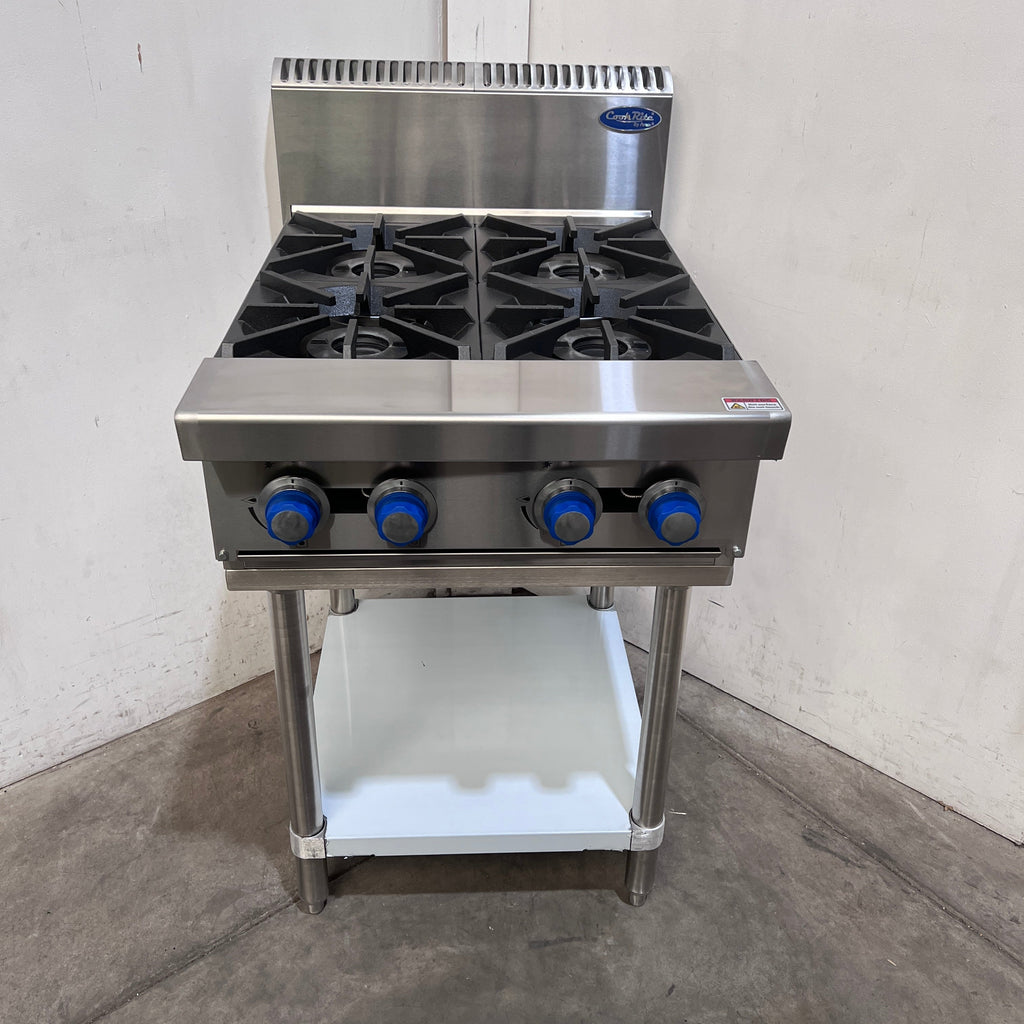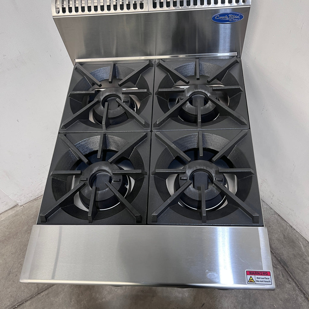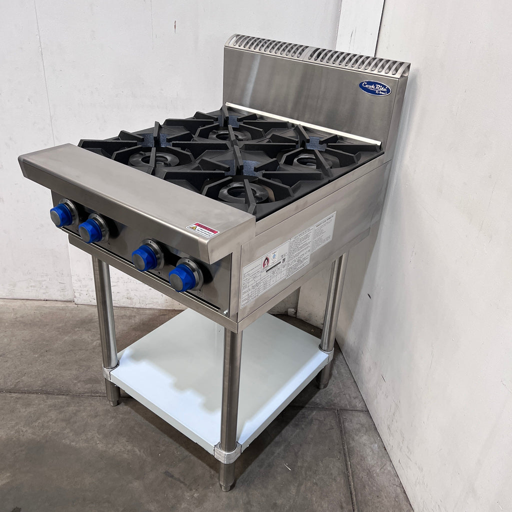 Cooktop. Features 4 Burner Cooktop, Drip tray, Adjustable feet, Mid shelf, Flame fail valve, Heavy-duty trivets, Standby pilot, S/S Finish, Scratches & Dents, 112Mj/hr, Natural Gas,600mmW x 800mmD x 1115mmH, 70KG