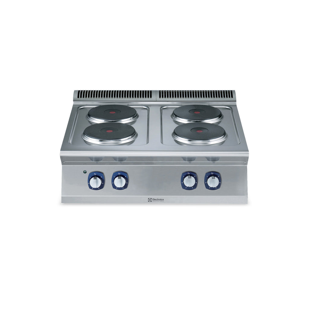 The Electrolux Professional 700XP 4 Hob Electric Cook Top provides efficient, versatile cooking with four 2.6 kW cast-iron plates sealed to a seamless stainless steel surface. Manufactured in Italy, this 800mm unit is designed for high-performance in professional kitchens where durability and hygiene are essential.