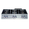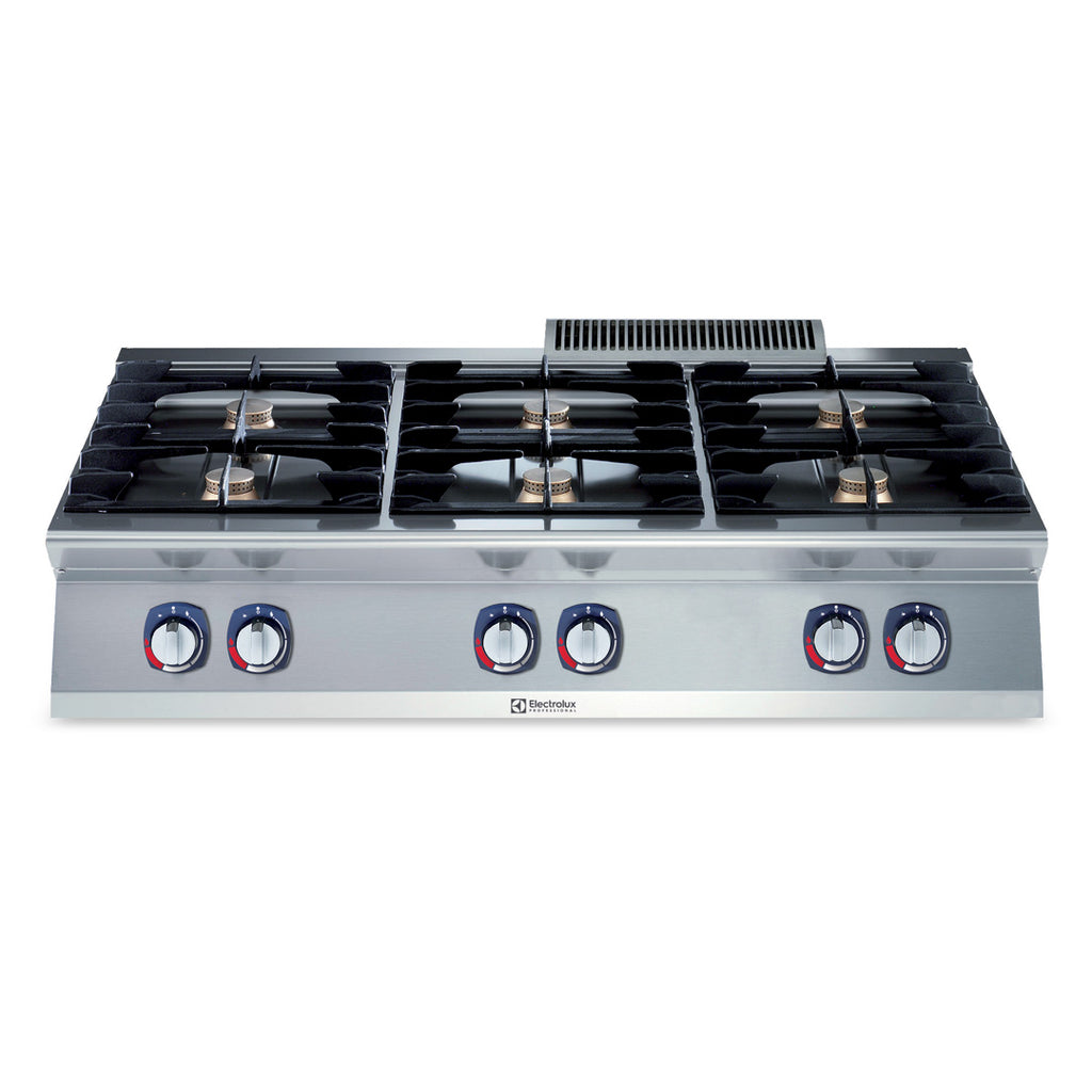The six 19.8 Mj high-efficiency flower flame burners each feature flame regulators and flame failure devices, providing adaptable heat output and safety by preventing gas leakage in case of accidental flame loss. Large cast iron pan supports with extended centre fins accommodate a broad range of pan sizes and are dishwasher safe for easy cleaning.