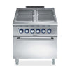 The cooktop includes four 4 kW electric hot plates, each hermetically sealed to a durable AISI 304 stainless steel top. Beneath, the electric oven features a 40 mm insulated door and ribbed cast-iron base, offering even heat distribution across three shelf levels that accommodate 2/1 GN trays. Independent thermostats for the top and bottom oven elements provide precise cooking control from 100°C to 300°C.