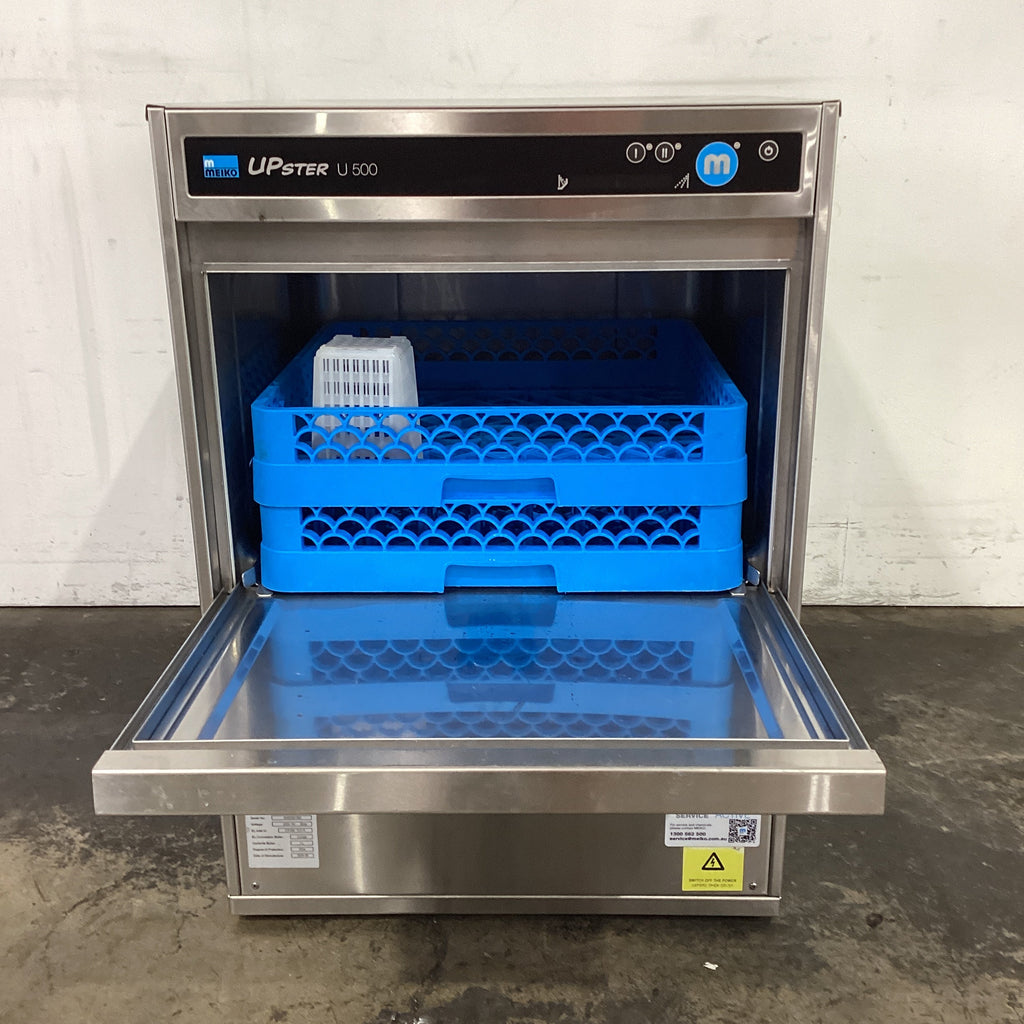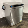 Undercounter Dishwasher. Features 120/180/240sec cycles, Detergent & rinse aid dispensers, Pump & gravity drain, Dish rack, Glass rack, Cutlery holder, Rollers on rear, S/S finish, Small dents, 15 amp 1 phase, 600mmW x 600mmD x 845mmH, 56KG