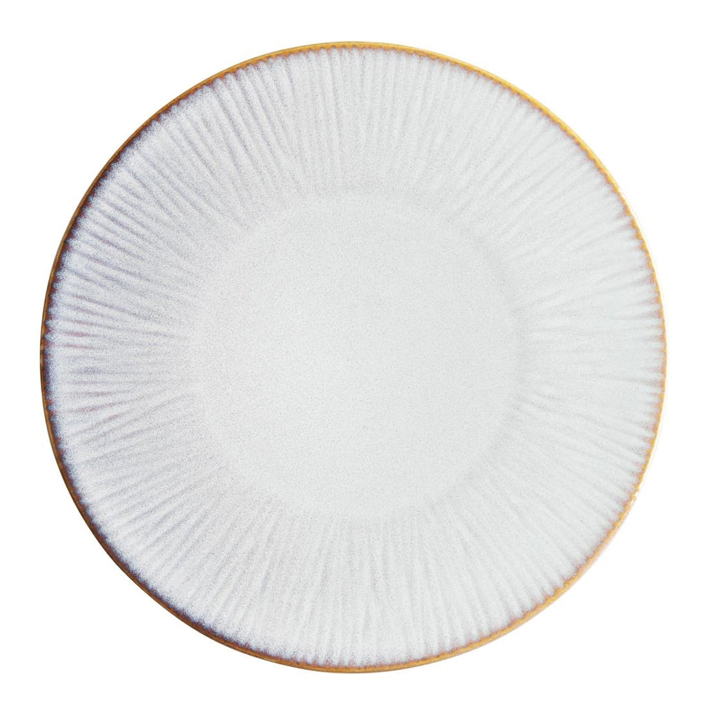 Olympia's Drift range is available in either a plain coupe shape or with a faint fantail embossment along the rim. Designed to complement each other, the plain and embossed options allow for versatile combinations. These Drift embossed coupe plates feature a sleek pale grey reactive glaze and a contrasting rim that not only adds a touch of style but also shapes the plate perfectly....