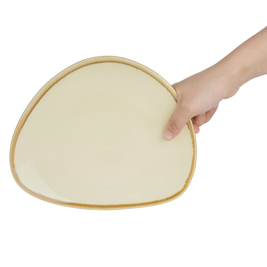 The sandstone coloured finish is perfectly suited to establishments that serve delicious, fresh, homemade food. Kiln is a collection from Olympia that uses a reactive glaze that interacts with the minerals naturally occurring inside the clay to create a pattern within the glaze that is individual to your plate. Artisans paint around the rim with a finish that has been specially designed to create slight runs and irregular patterns, making imperfections a part of the character of the plate.