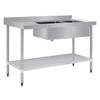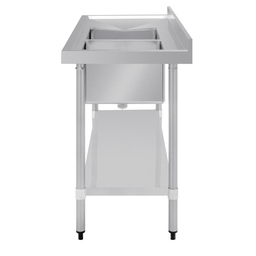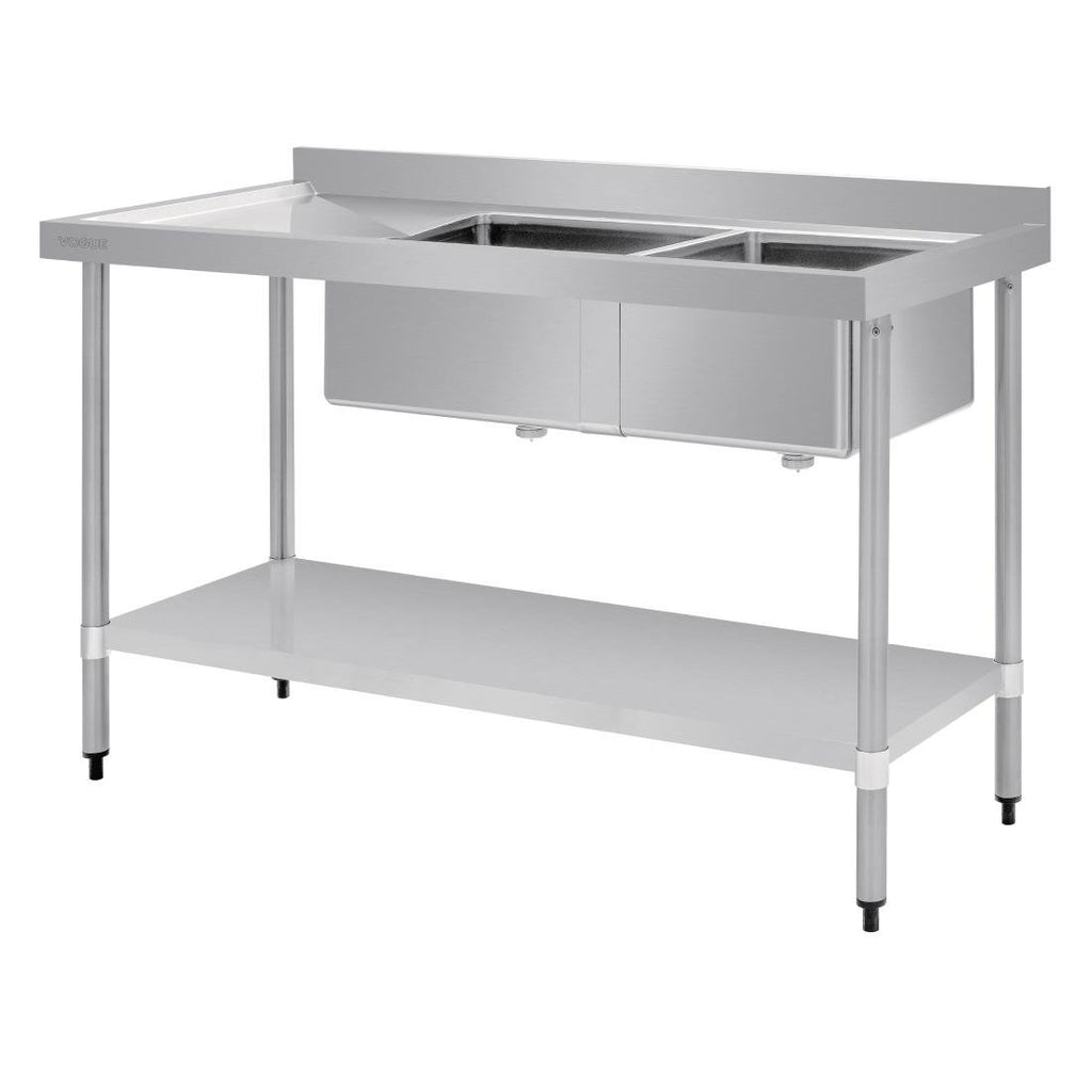 This 1500mm stainless steel sink from Vogue makes washing and drying dishes easy, thanks to two large bowls and a sloped draining board for rapid drying. A stainless steel construction makes the unit extremely easy to clean, helping you to maintain hygiene through every service. The large undershelf ensures you have practical storage space for kitchen essentials, from pots, pans and utensils to ingredients and foods.250mm deep bowl (product does not come with holes above sink).