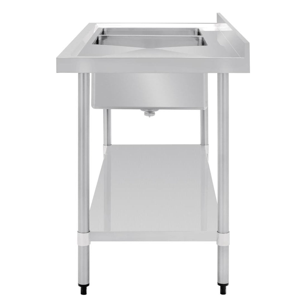 Rinse and wash at the same time with this double bowl sink unit from Vogue. The double sinks speed up dish washing and food prep in any commercial kitchen by allowing two things to be done at once, such as rinsing dirty dishes and cleaning them, or by allowing two people to work at the same unit. The unit is made from a strong and durable stainless steel that makes it easy to clean and effortless hygiene. A draining board to the right of the unit offers space to dry dishes or store dirty ones and the large undershelf...