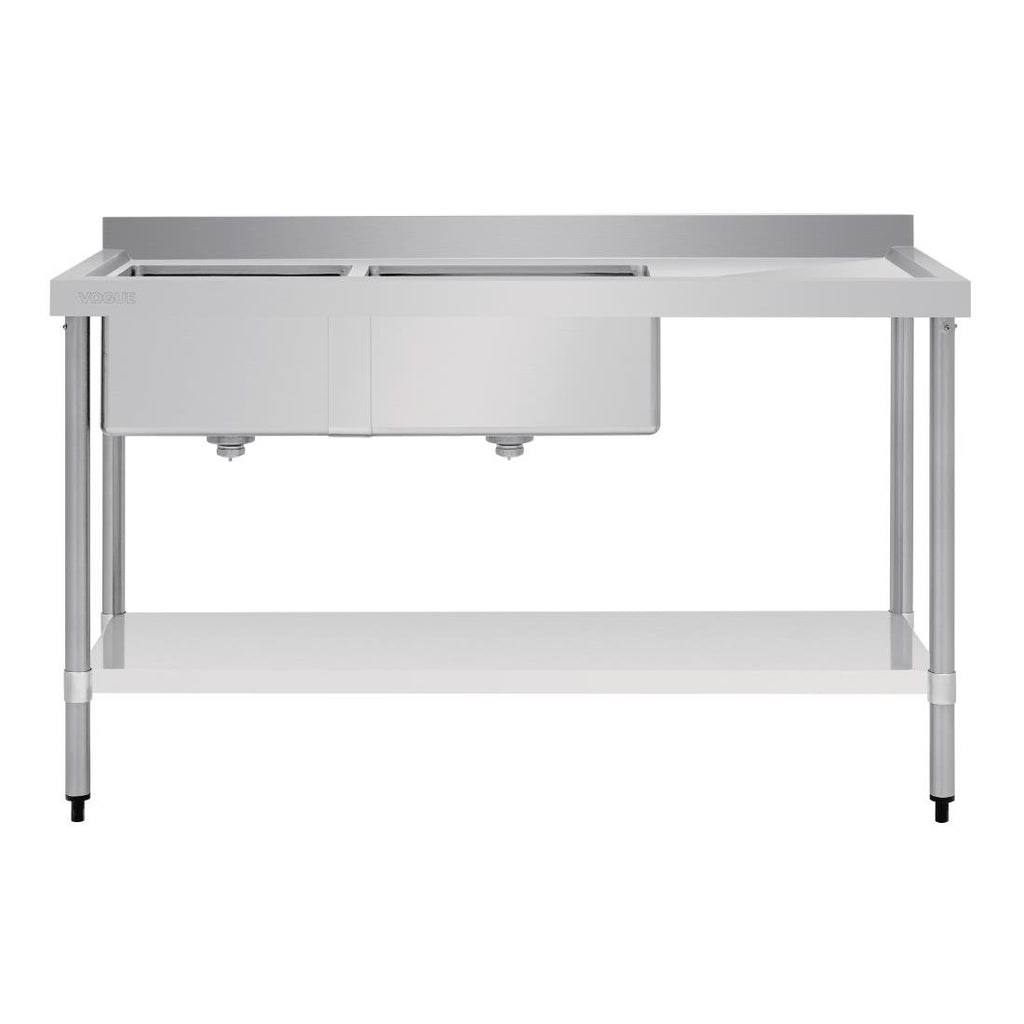 This high quality stainless steel sink is supplied with stand, shelf and waste guard. Featuring a double bowl and right hand drainer (1500 x 700mm). The galvanised steel under shelf provides extra storage space for pots and pans. Delivered flat packed for easy assembly. 300mm deep bowl (product does not come with holes above sink) . Taps not included.