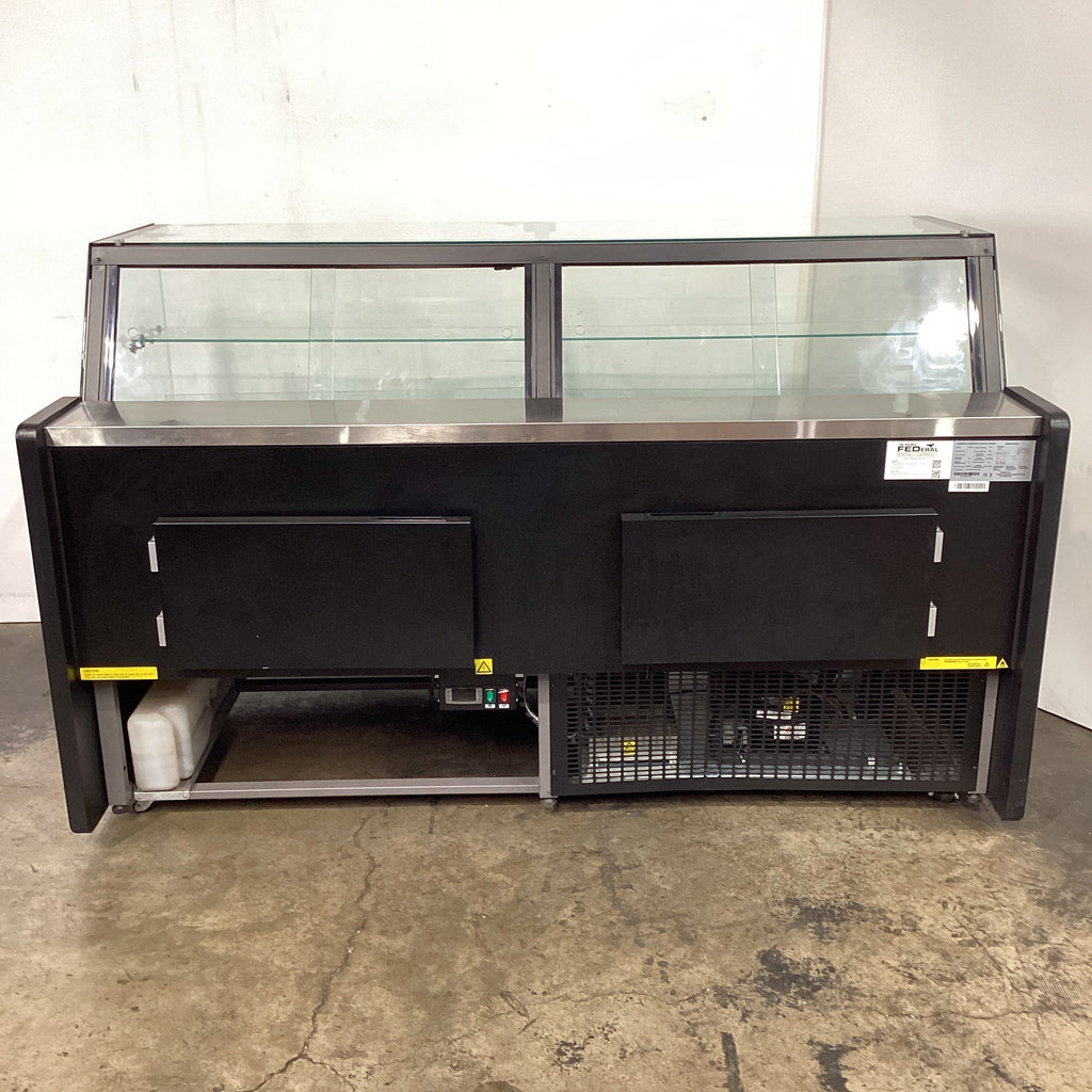 Angled glass Deli Display. Features Angled glass, 670L capacity, Internal lighting, Digital Temp Control 0°C to 5°C, 2 door chiller, On castors, Climate class normal, Black & S/S finish, Scratches & dents, 10 amp 1 phase, 1965mmW x 940mmD x 1210mmH, 190KG
