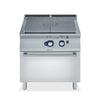 Below the cooktop, a gas-heated standard oven features stainless steel burners with a self-stabilising flame beneath the base plate. The oven thermostat is adjustable from 110°C to 270°C, with a stainless steel chamber equipped with three runner levels to accommodate 2/1 GN shelves or steam pans. The ribbed enamelled steel base plate ensures even heat distribution for consistent cooking results.