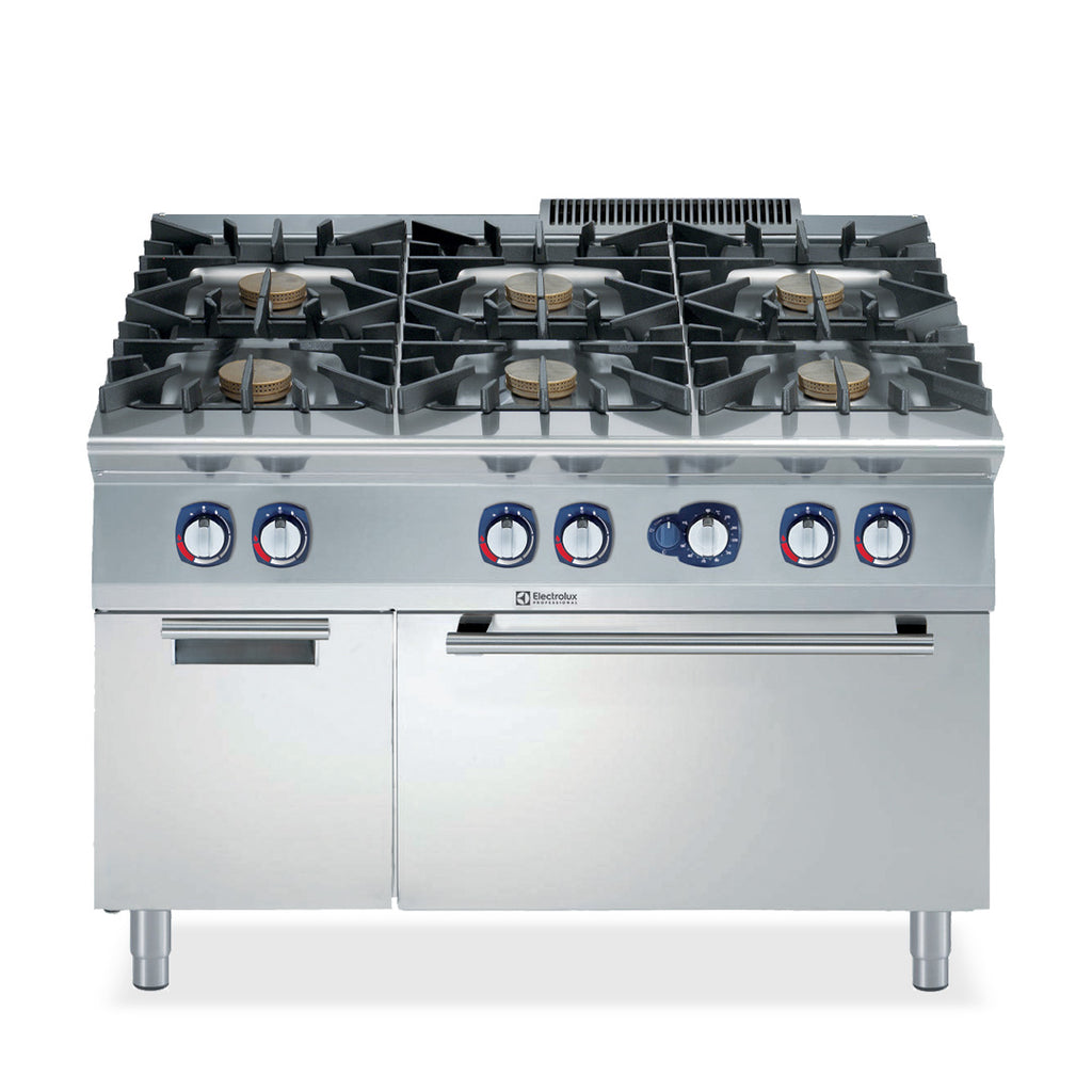 Designed for high-demand commercial kitchens, the Electrolux Professional 900XP 6 Burner Gas Range with gas oven combines superior cooking power and practical storage in a durable 1200 mm-wide format. Manufactured in Italy to Electrolux’s exacting standards, this robust unit delivers both precision and performance across a large working surface.