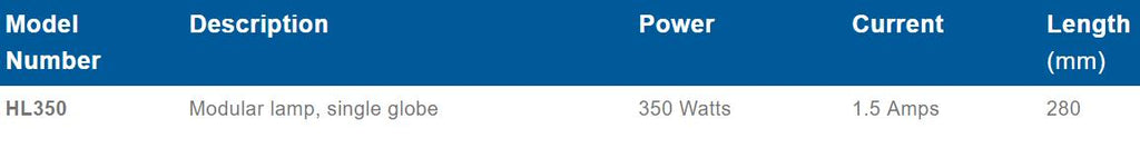 The HL350 is a compact modular heat lamp manufactured from stainless steel, incorporating an easy fit 230 volt, 350 watt globe. The easy fit globes feature a protective quartz glass outer layer that encapsulates the inner globe allowing for safe handling. It is designed for use in custom fabricated installations as a modular component to be wired in parallel.