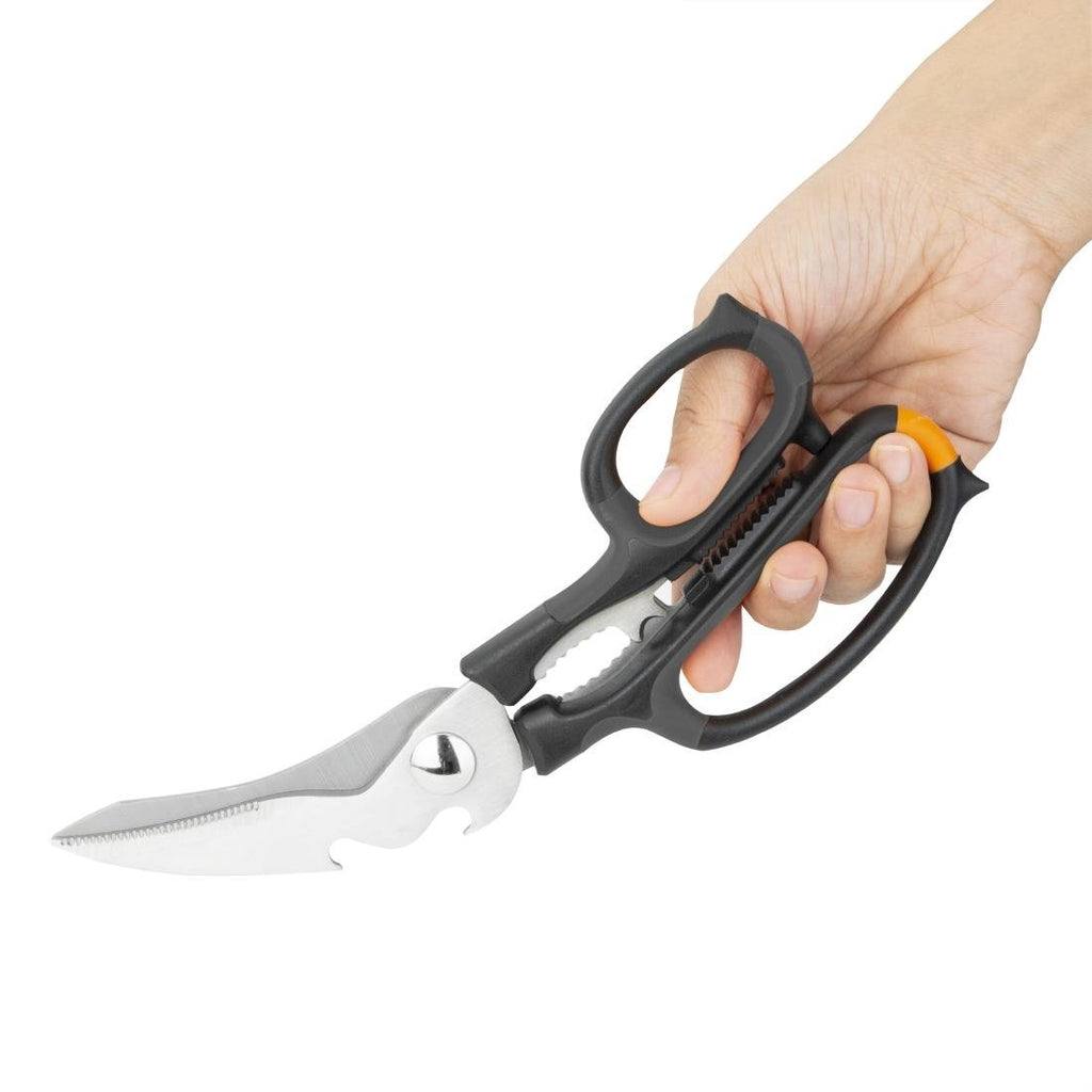 Making cutting through ingredients and packaging easy with Vogue multi-purpose stainless steel kitchen scissors. With their sharp stainless steel blades and ergonomic handles, the scissors comfortable to use and highly effective - essential for those long prep times.For further convenience, the scissors are dishwasher safe, making them effortless to clean.