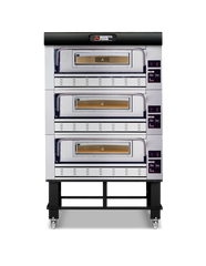 A special double refractory deck with a vacuum in the middle distributes heat coming from the burner, allowing for even baking. The heat generated by the burner rises up on the sides and to bake the top of the product, and then escapes through the special chimney. The P110G is available in natural gas or LPG and 2 different sizes, the P150G available in natural gas and LPG in just the one size.