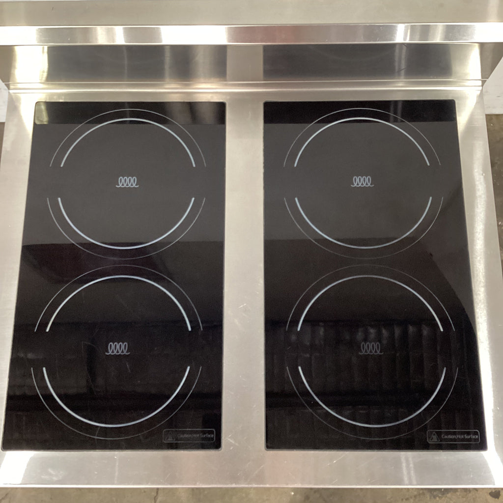 Induction 4-Burner Cooker. Features Ceramic glass cooktop, 5000W power each burner, Touch control/Adjust the power by knob 60°C to 240°C, Timer range: 0-180min, Storage space under, Adjustable feet, S/S finish, Surface scratches, 32 amp 3 phase hard wired, 800mmW x 700mmD x 985mmH, 90KG