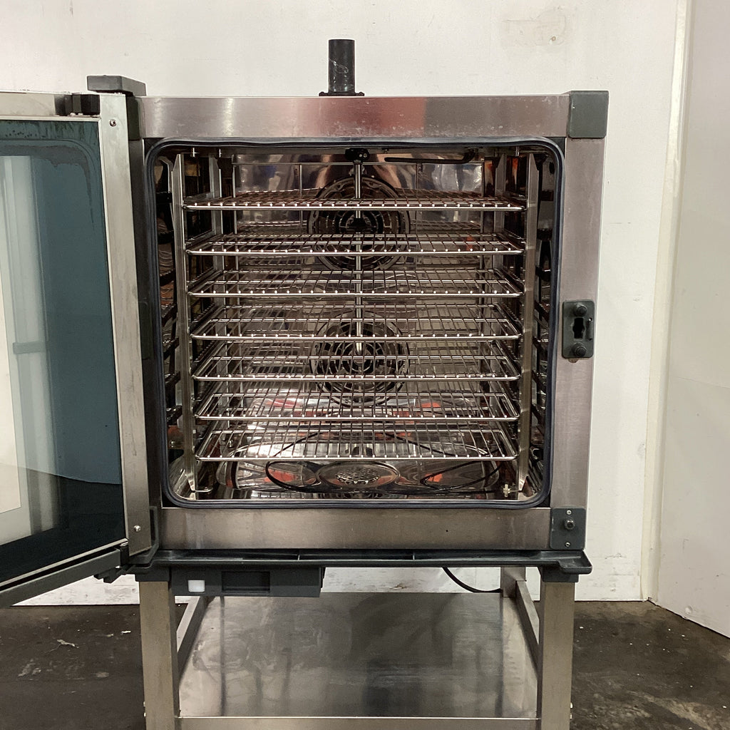 Combi Oven. Features 7 tray capacity, 7 trays included, Touch screen controls, Self cleaning, Door opens to LHS, On stand, Adjustable feet, S/S finish, Scratches, 10 amp 1 phase, L.P.G, 755mmW x 850mmD x 1380mmH, 92KG