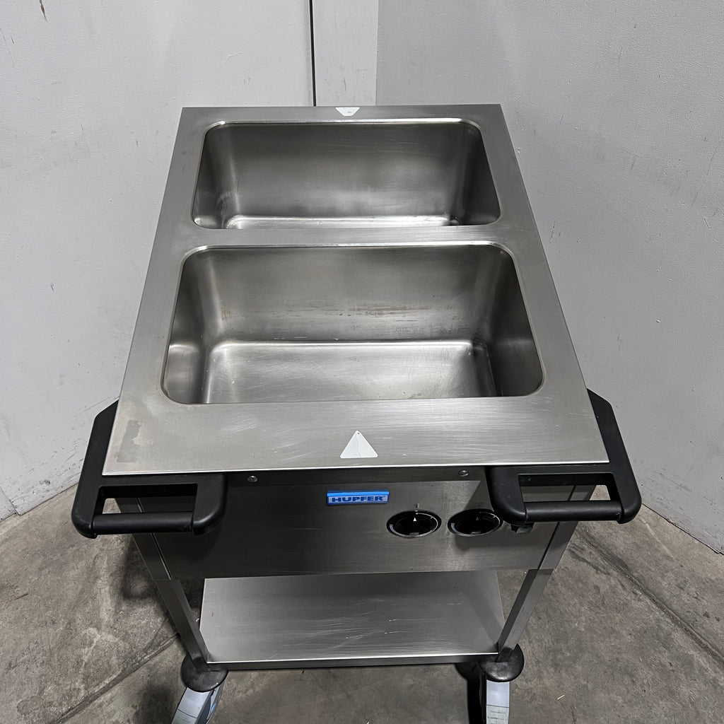 Bain Marie. Features On Castors, Operation: Wet heating only, Heating system: Energy?efficient foil heating elements, Individual thermostatic control, Temperature range: 30?°C 95?°C, S/S finish, Scratches & Dents, Mobile foil?heated bain marie trolley, transporting and hot?holding prepared food, Capacity: 2 × GN 1/1 pans, up to 200?mm deep, 10 amp 1 phase, 677mmW x 914mmD x 900mmH, 35KG