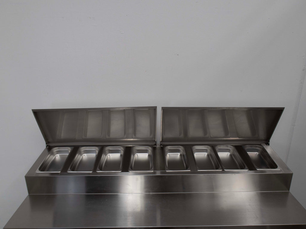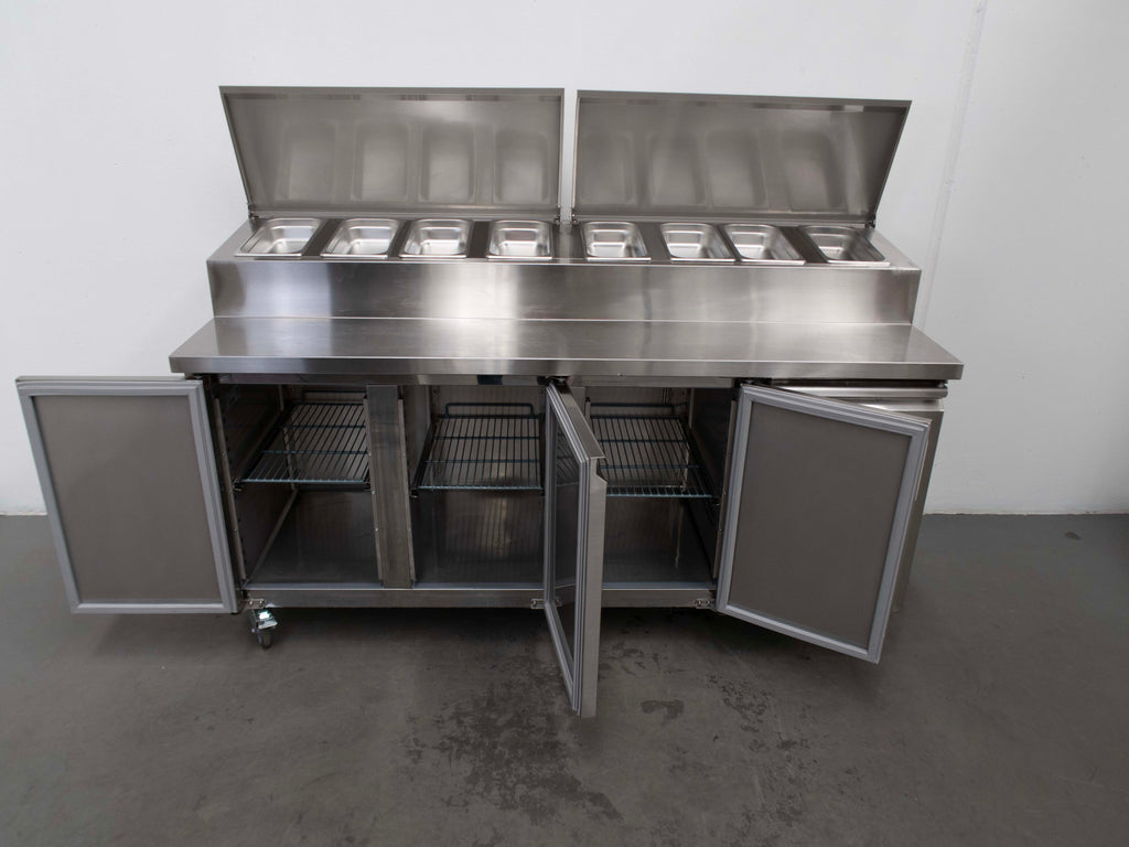 Pizza Prep Bench. Features 2 x S/S Lift Up Lids, 3 Solid Self Closing Doors , 8 X 1/3 GN Pans, Digital Controller, 3 x Shelves, Bench, Castors, Climate class normal, S/S finish, , 417L Gross Volume, Fan-Forced Cooling Scratches & Dents, 10 amp,1 phase. 1800mmW x 700mmD x 1400mmH. 140KG.
