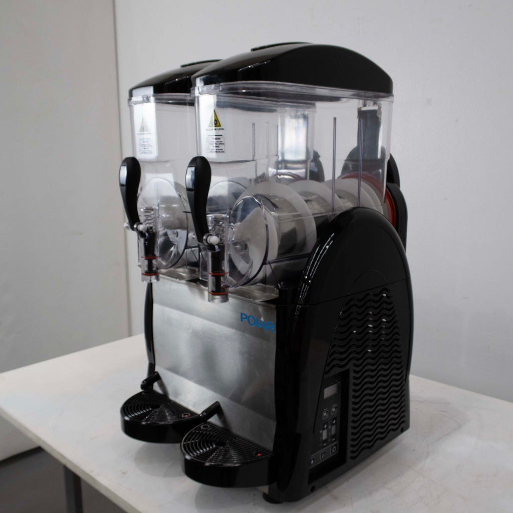 Slushy Machine. Features Capacity 24 litres, Adjustable chilled drink mode for fruit juices, Lid is easy to remove and fasten when filling tank with slush mixture, Adjustable stirring speed, User-friendly digital temperature controls and display, Independently operated tanks, Black, Scratches & Dents, 10 Amp 1 Phase, 460mmW x 535mmD x 780mmH, 51KG