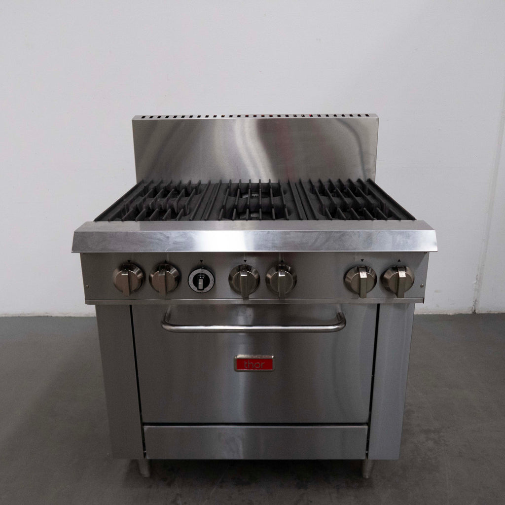 Range Oven. Features Static oven, Constructed from stainless steel, Pull down oven door, Drip tray, Adjustable feet, Flame fail valve, S/S Finish, Scratches & Dents, 221.5Mj/hr, 6 Open burners, Natural Gas,915mmW x 815mmD x 1090mmH, 155KG