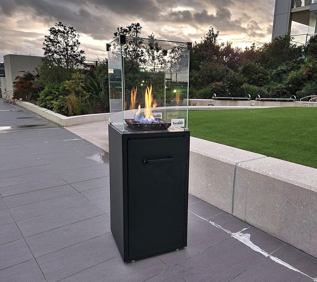 Transform your outdoor space with our black gas heater, a smart and versatile choice designed for optimal ambiance. Featuring four glass sides, this heater creates a captivating setting, especially when ideally positioned near a back wall. Mounted on M8x40 ball-jointed leveling feet for stability, it comes complete with lava rocks that provide a mesmerizing glowing effect.