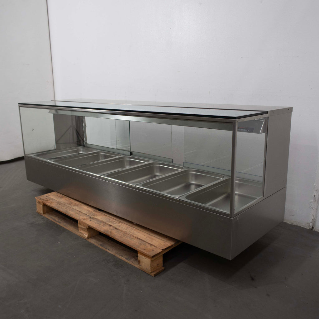 Bain Marie. Features 5 x Pans, Infra-red heat lamps, Toughened straight front glass with rear sliding doors, S/S finish, Scratches & Dents, Air?insulated, double?skinned tank, Multiple heating elements, 15 Amp 1 Phase, 2000mmW x 610mmD x 680mmH, 80KG