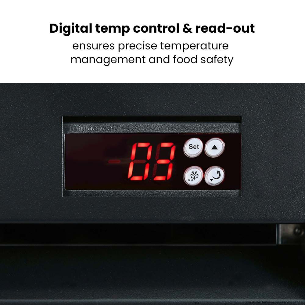 This series features a unique sliding door for interior access. It also includes five levels of strong shelving, interior LED lighting, powerful embrace compressors, digital temperature control, fan-forced evaporator cooling, self-evaporating drainage, and double-glazed doors for extra toughness and optimal viewing.