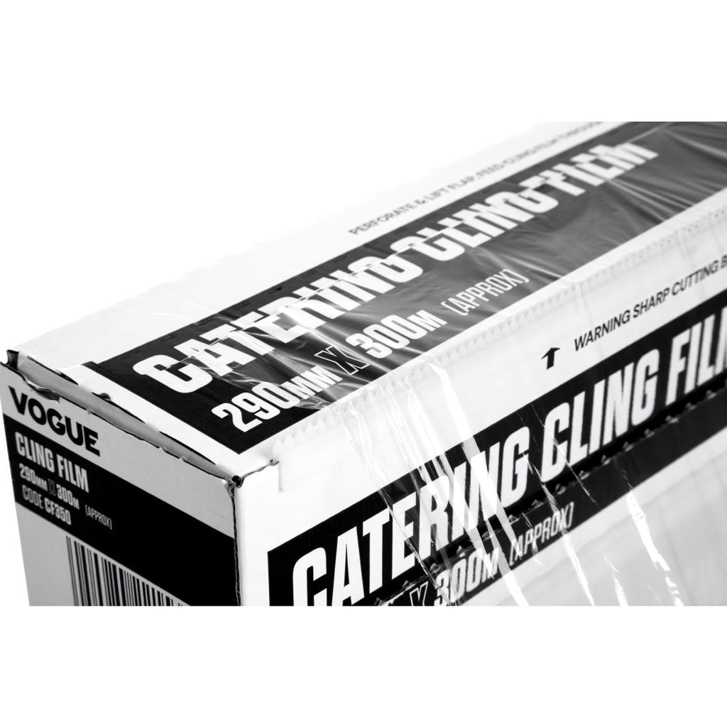 Perfect for retaining moisture in foods and protecting from air spoilage, this 300m long roll of cling film from Vogue is supplied in a handy cardboard dispenser.