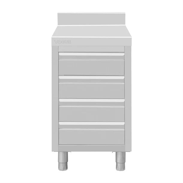 Make the most of your kitchen space with the four-drawer workstation with upstand from Vogue. This stylish, yet practical unit features four sliding drawers that provide quick and easy access to a variety of equipment and ingredients. This makes it ideal for use in commercial kitchens where it can be used as an all-in-one storage and workstation hybrid. And thanks to its strong stainless steel construction, not only is it highly durable - it's easy to clean too.